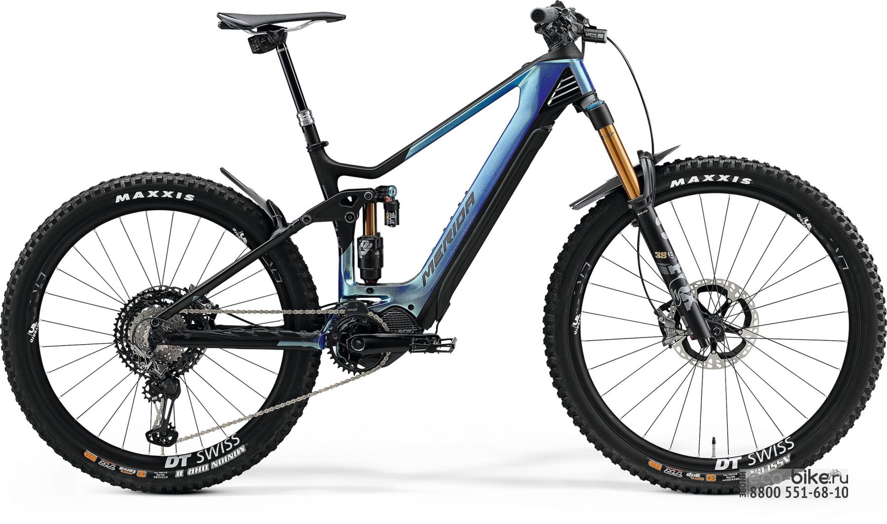 Электровелосипед Merida eONE-SIXTY 10K - новейшая модель двухподвеса с достойными показателями. Установлен электромотор Shimano E8000 мощностью 250 Вт. Электровелосипед может разогнаться до 25 км/ч. Без подзарядки можно проехать от 30 до 50 км. Колеса DT Swiss Spline HXC1250 Spline 30 boost с широкими покрышками Maxxis Assegai / Maxxis Agressor отлично держат дорогу и сглаживают неровности. Дисплей Shimano SC-EM800 отражает основные параметры поездки, такие как скорость, пройденный путь, уровень заряда батареи и т.д.